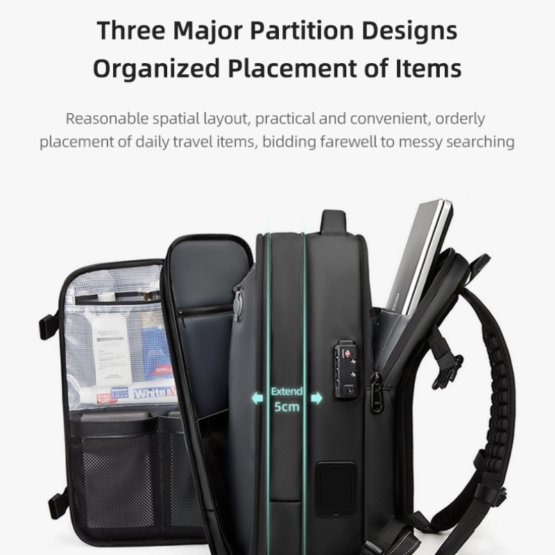Zeg vaarwel tegen grote bagage, deze rugzak is ontworpen om uw inpakervaring te optimaliseren. Dankzij geavanceerde compressietechnologie bespaart u tot 50% meer ruimte, waardoor het de perfecte oplossing is voor reizigers die extra ruimte nodig hebben zonder extra gedoe. Pak meer in, reis slimmer en geniet van een beter georganiseerde reis.